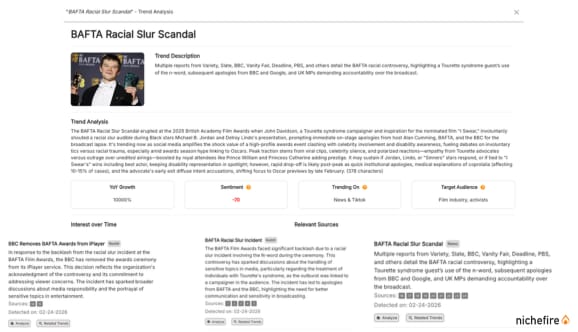 This week, I ran a Firesearch on “BAFTA”, “John Davidson Tourette’s”, and “BBC edit decision”, and here’s what surfaced: